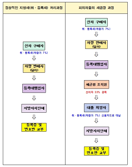 피의자들은, 경제적으로 어려운 상황에 있는 서민들도 대부분 신용카드는 가지고 있다는 점을 이용, 광고를 보고 연락한 사람들에게 금융업체 직원인 것처럼 소개하며 신용카드 정보만 있으면 복잡한 서류 작성이나 절차 없이 소액 대출을 해주는 것처럼 안내했고, 미리 수집해둔 제3자의 자동차 취·등록세 납부 정보를 통해 ‘세금깡’을 하고 급전이 필요한 자에게 선이자를 공제한 돈을 융통해주는 방식으로 범행을 지속해왔다.