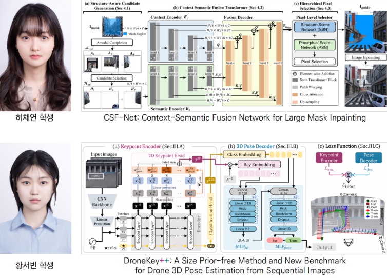 허채연 학생(석사과정생)은 대형 마스크 인페인팅 연구로 IEEE WACV 2026에, 황서빈 학생(석·박통합과정생)은 드론 3D 자세 추정 연구로 IEEE ICRA 2026에 각각 게재 승인을 받았다.