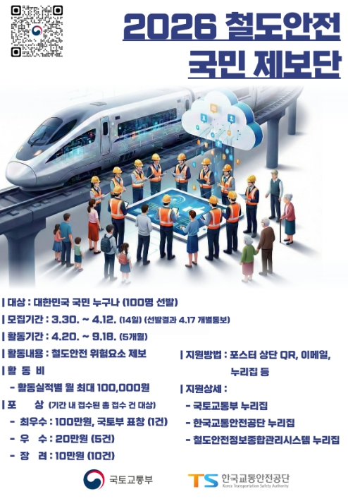 ‘2026 철도안전 국민제보단’은 철도 이용 및 정책, 안전에 관심이 있는 대한민국 국민이라면 누구나 지원 가능하다.
