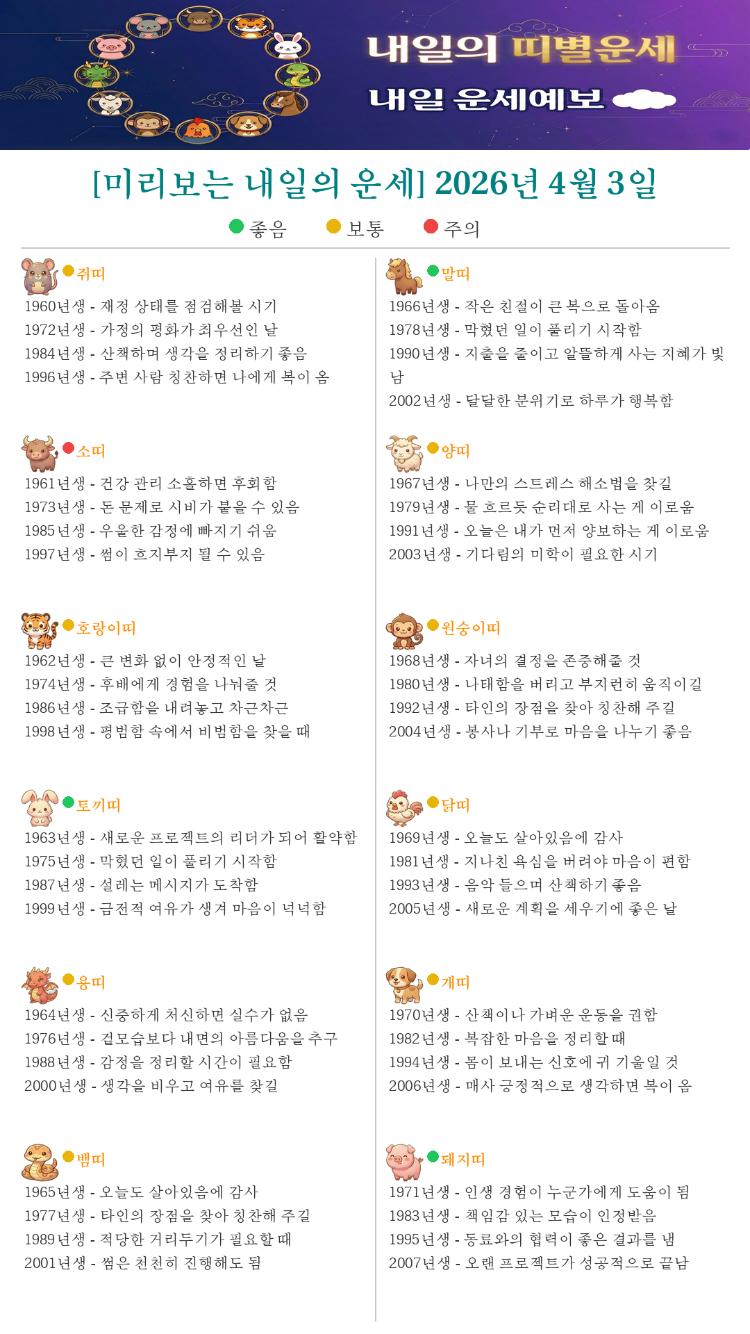 | 하루를 버텨낸 퇴근길, 우리는 내일을 걱정하지만 정작 내일을 준비할 여유는 갖지 못한 채 집으로 향합니다. 지역에서 살아가는 청년의 하루 역시 크게 다르지 않습니다. 포커스N전남은 ‘미래를 맞히는 운세’가 아니라, 내일을 조금 더 단단하게 살아가기 위한 마음의 점검으로 띠별운세를 다시 해석합니다.〈퇴근길 미리보는 내일의 띠별운세〉는 오늘의 피로를 정리하고, 내일의 선택을 차분히 바라보자는 취지에서 출발했습니다. 오늘도 고생 많으셨습니다. 내일은, 지역에서의 삶이 조금 더 나아지길 바랍니다.[편집자주] |