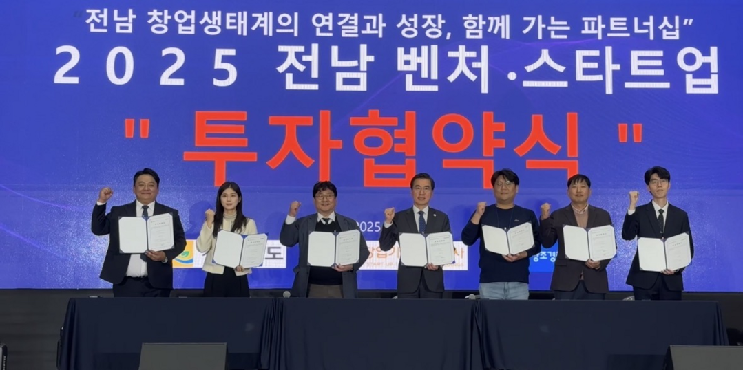 전남창조경제혁신센터와 ㈜전남지역대학연합창업기술지주는 11월 6일 순천만생태문화교육원에서 ‘2025 전남 벤처·스타트업 투자협약식’을 공동 개최하고, ▲㈜포엠 ▲㈜씨엔에스컴퍼니 ▲㈜케나즈 ▲㈜자블리 ▲㈜컬리버 등 전남을 대표하는 유망 스타트업 5개사와 공동 투자협약을 체결했다.
