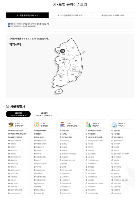 시·도를 선택하면 해당 지역의 주요 관심 주제(‘토픽’) 5개와 각 주제별 주요 키워드 20개가 함께 제시되어 총 100개의 공약이슈를 확인할 수 있고, 구·시·군을 선택하면 3개 토픽과 토픽별 20개의 키워드를 통해 총 60개 공약이슈를 볼 수 있다.