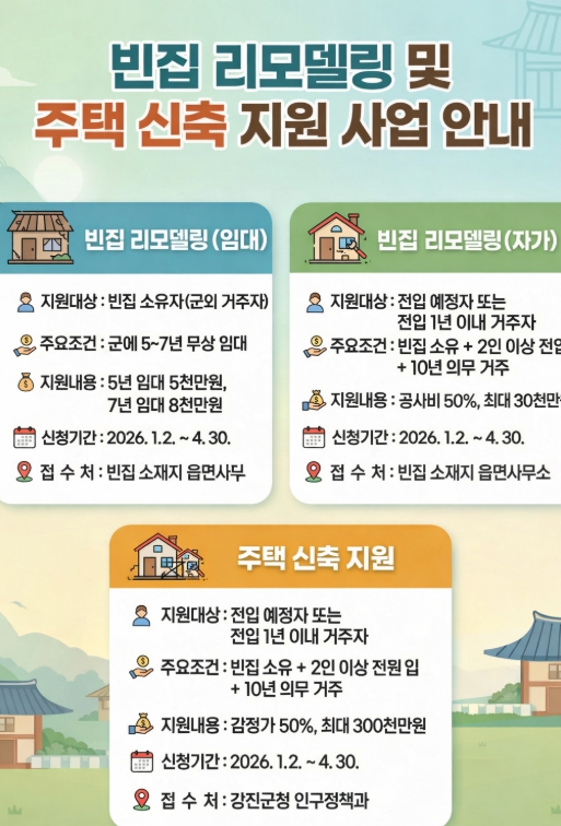 자세한 내용은 강진군청 인구정책과 주거지원팀 또는 각 읍·면사무소로 문의하면 된다.