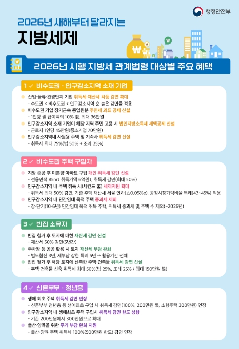 또한, 인구감소지역 내 창업·사업장 신설 시 부동산 취득세·재산세 면제(5년간, 이후 3년간 재산세 50% 경감) 대상 업종을 기존 32개 업종에서 신재생에너지업, 의료업, 야영장업 등을 추가한 40개 업종으로 확대한다.