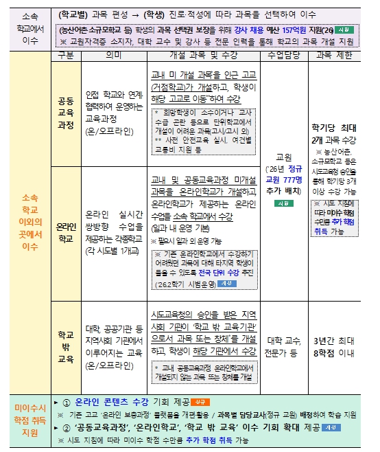 학생들이 다양한 선택 과목을 이수할 수 있도록 선택 과목의 개설 여건도 개선한다. 온라인학교와 공동교육과정 거점학교 등에 정규교원을 추가 배치(’26, 777명)하고, 농산어촌·소규모 학교(442교) 등에서도 다양한 과목을 개설할 수 있도록 강사 채용을 지원(’26 1학기~, 157억 원)한다. 온라인학교의 전국 단위 수강을 추진하고, 고교—대학 연계 학점 인정 과목을 통해 학생의 추가적인 학교 밖 교육 이수도 지원(’26.1학기~, 10개 시도, 20여 개 대학 참여 예정)한다. 단위학교에서 개설되지 않은 과목의 온라인학교, 공동교육과정 이수 노력은 학교생활기록부에 기록된 교육과정 편제표를 통해 대학이 확인할 수 있다.