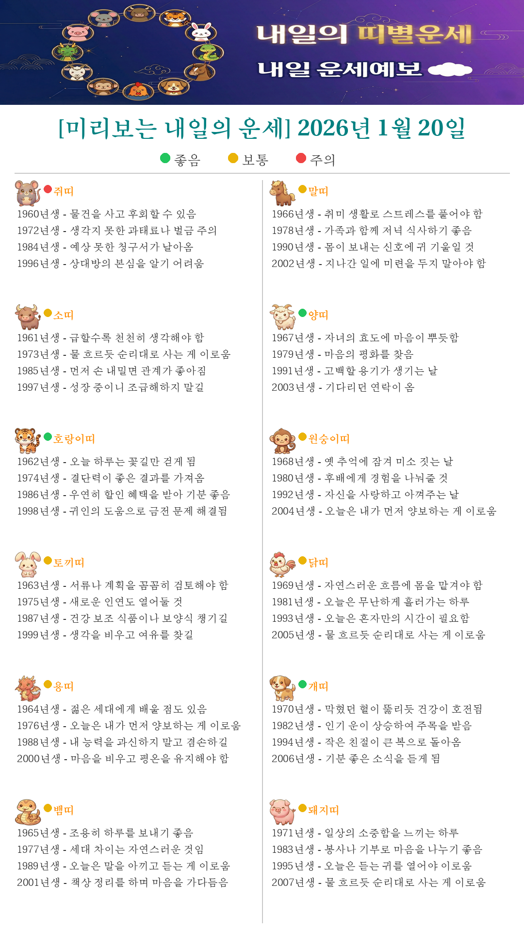 | 하루를 버텨낸 퇴근길, 우리는 내일을 걱정하지만 정작 내일을 준비할 여유는 갖지 못한 채 집으로 향합니다. 지역에서 살아가는 청년의 하루 역시 크게 다르지 않습니다. 포커스N전남은 ‘미래를 맞히는 운세’가 아니라, 내일을 조금 더 단단하게 살아가기 위한 마음의 점검으로 띠별운세를 다시 해석합니다.〈퇴근길 미리보는 내일의 띠별운세〉는 오늘의 피로를 정리하고, 내일의 선택을 차분히 바라보자는 취지에서 출발했습니다. 오늘도 고생 많으셨습니다. 내일은, 지역에서의 삶이 조금 더 나아지길 바랍니다.[편집자주] |