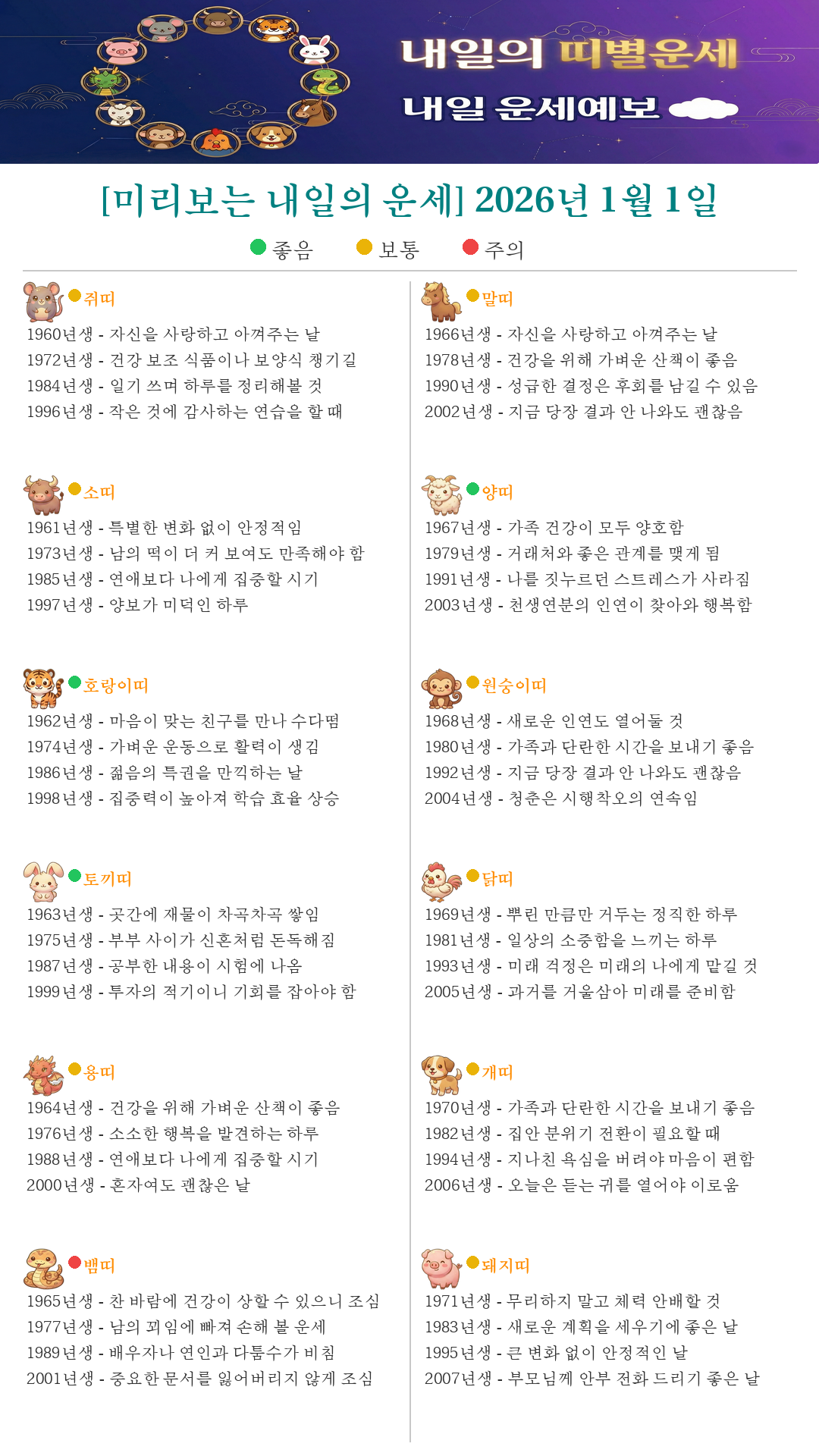 | 하루를 버텨낸 퇴근길, 우리는 내일을 걱정하지만 정작 내일을 준비할 여유는 갖지 못한 채 집으로 향합니다. 지역에서 살아가는 청년의 하루 역시 크게 다르지 않습니다. 포커스N전남은 ‘미래를 맞히는 운세’가 아니라, 내일을 조금 더 단단하게 살아가기 위한 마음의 점검으로 띠별운세를 다시 해석합니다.〈퇴근길 미리보는 내일의 띠별운세〉는 오늘의 피로를 정리하고, 내일의 선택을 차분히 바라보자는 취지에서 출발했습니다. 오늘도 고생 많으셨습니다. 그리고 오늘은 2025년의 마지막 날입니다. 을사년(乙巳年) 한 해, 정말 애쓰셨고 수고 많으셨습니다. 내일부터 시작될 병오년(丙午年) 새해에는 더 좋은 일들만 가득하시길 바랍니다. 새해 복 많이 받으세요.[편집자주] |