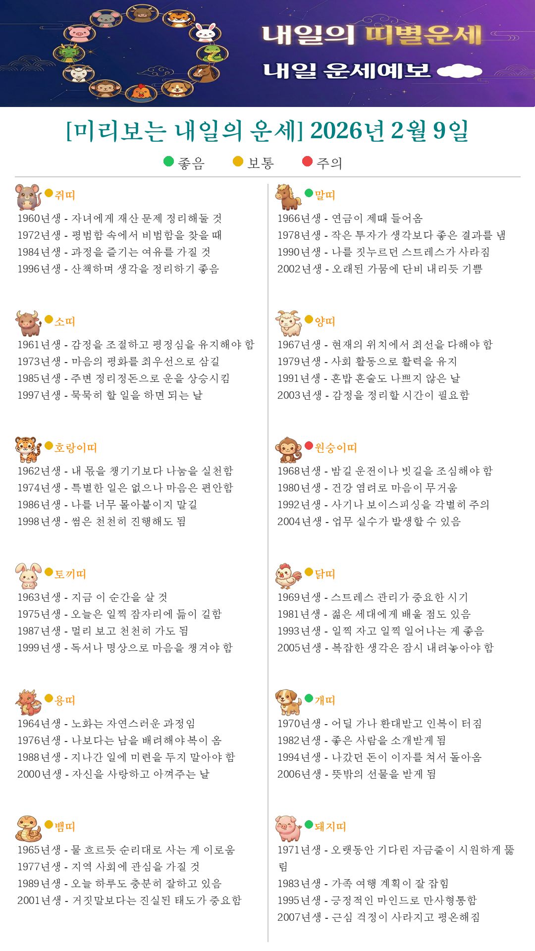 [미리보는 내일의 운세] 2026년 2월 9일