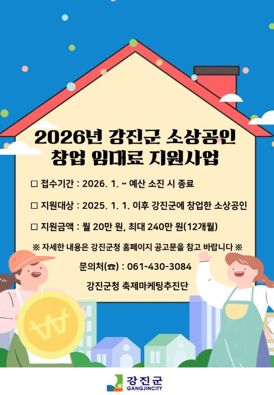 이 사업은 강진군에서 창업한 소상공인을 대상으로 월세 또는 전세 계약으로 발생하는 임대료 일부를 지원해 고정비용이 절감되어 소상공인들에게 실질적인 도움이 될 예정이다.