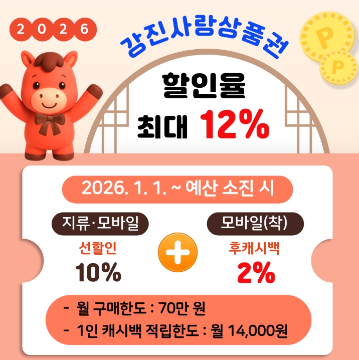 강진군은 7년 연속 강진사랑상품권 할인율을 연중 10%로 유지하며 지역경제 활성화에 앞장서 왔으며, 2026년에도 상품권 발행과 할인 정책을 안정적으로 운영해 지역 내 소비 촉진과 소상공인 경영 안정을 지속적으로 지원할 계획이다.