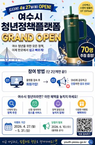 이벤트는 플랫폼에 신규 가입한 18세부터 45세까지의 여수 청년이면 누구나 참여할 수 있다.