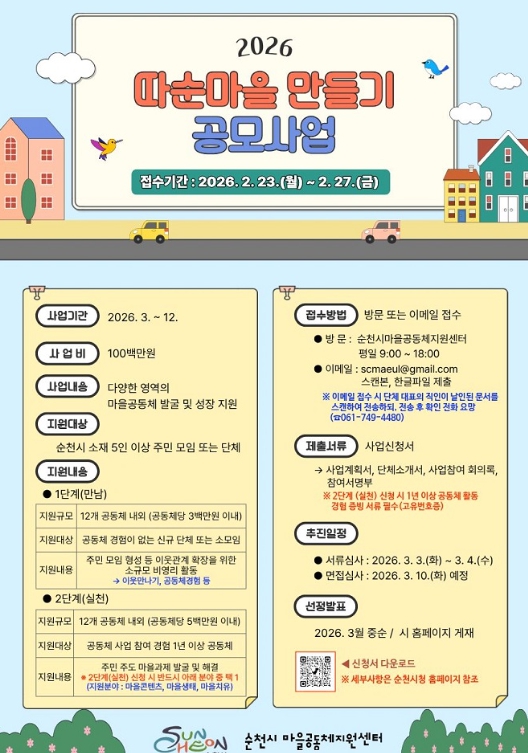 이번 공모사업은 3월부터 12월까지 추진되며, 총 사업비 1억 원 규모로 운영된다. 신청대상은 순천시 소재 5인 이상 주민 모임 또는 단체이다.