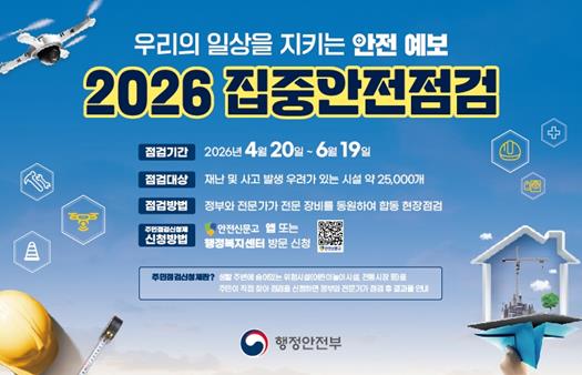 아울러 올해는 주민이 생활 주변의 위험 요인을 직접 제보하고 점검에 참여할 수 있도록 ‘주민점검신청제’를 운영해 주민 참여형 안전관리도 강화할 방침이다.