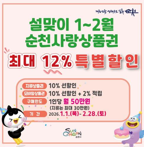 시에 따르면 2026년 1월부터 진행 중인 순천사랑상품권 할인행사에 따라 지류형은 10% 선할인, 모바일형은 10% 선할인에 사용금액의 2%를 후캐시백으로 제공해 총 12% 혜택을 받을 수 있다.