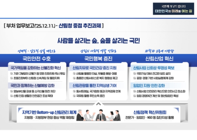 산림청은 산림재난으로부터 국민의 생명과 재산을 지키고, 산림을 국민 삶의 질 향상을 위한 핵심 자산으로 육성한다. 중점 추진 과제는 국민안전 수호, 국민행복 증진, 산림산업 혁신이다.