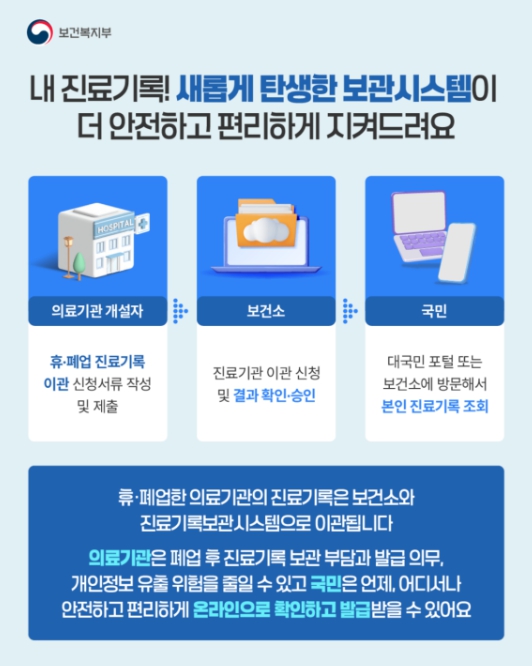 휴·폐업 의료기관 진료기록보관시스템은 병원이 문을 닫아도 진료기록을 국가가 안전하게 보관하고, 국민이 필요할 때 해당 기록을 열람하거나 사본을 발급받을 있도록 지원하는 시스템으로, 지난해 7월 21일부터 본격적으로 서비스를 시작했다.