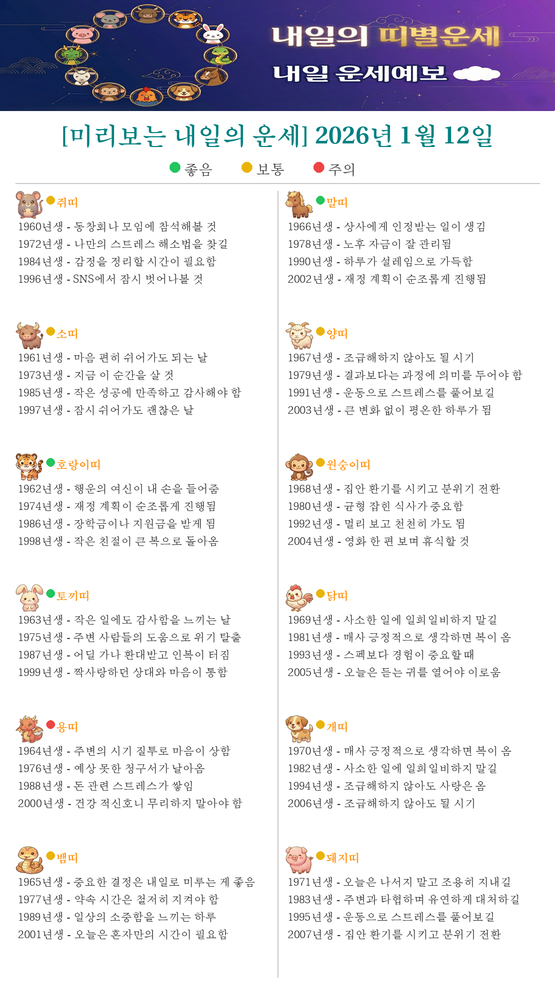 [미리보는 내일의 운세] 2026년 1월 12일
