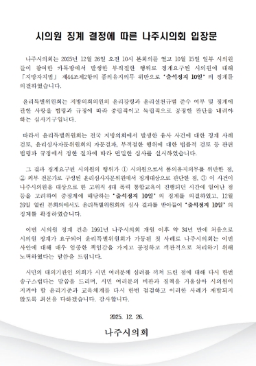 또한 의회는 이번 시의원 징계 건이 1991년 나주시의회 개원 이후 약 34년 만에 처음으로 시의원 징계가 요구되어 윤리특별위원회가 가동된 첫 사례라고 밝히고, 이번 사안에 대해 매우 엄중한 책임감을 가지고 공정하고 객관적으로 처리하기 위해 노력했다는 말씀을 전했다.