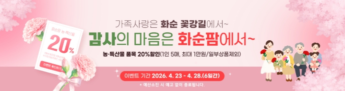 ‘감사의 마음 전달 쪽지’ 코너는 이벤트 게시판에 가족이나 스승, 소중한 이에게 전하는 감사 메시지를 작성하면, 우수 작성자 10명을 선정해 화순팜 입점 농특산물 등 2~3만 원 상당의 상품을 증정한다.
