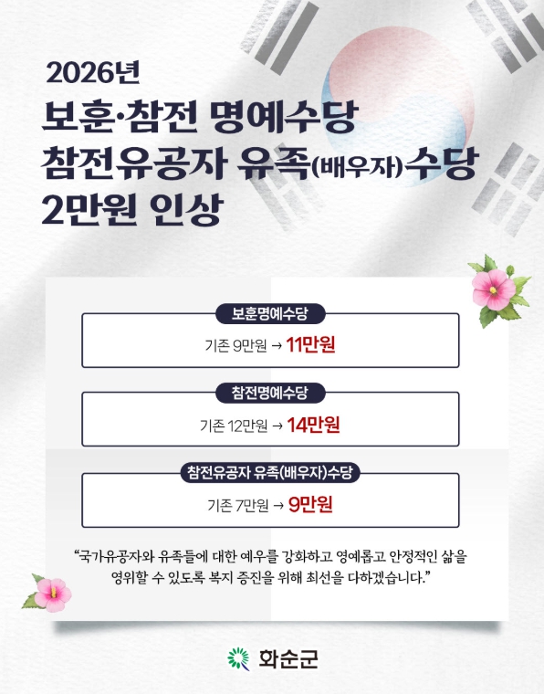이번 인상 대상은 ▲보훈수당 ▲참전명예수당 ▲참전유공자 유족(배우자)수당으로, 각각 월 2만 원씩 인상된다.