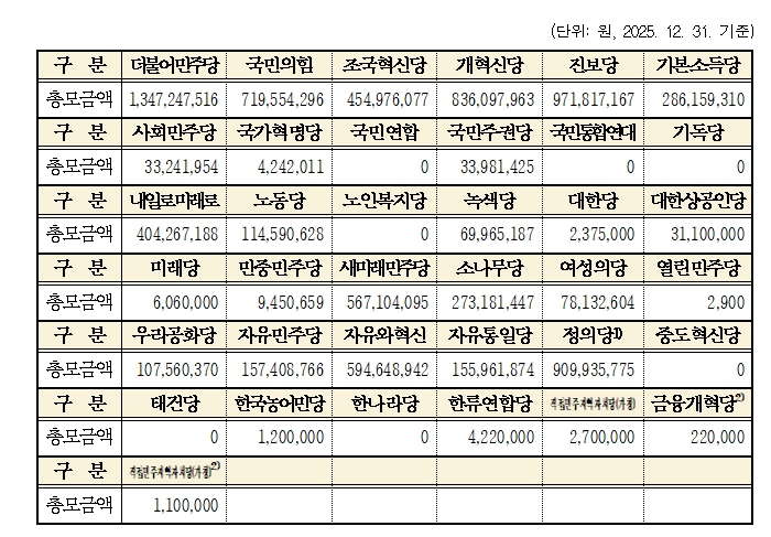 중앙당후원회 모금액은 ▲더불어민주당이 13억 4천7백여만 원으로 가장 많았으며, ▲진보당 9억 7천1백여만 원 ▲정의당 9억 9백여만 원 ▲개혁신당 8억 3천6백여만 원 ▲국민의힘 7억 1천9백여만 원 ▲자유와혁신 5억 9천4백여만 원 순으로 나타났다.