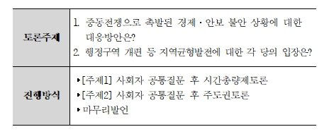'공직선거법'제82조의3에 따라 개최하는 이번 토론회는 총 5개 정당이 참여하여▲ ‘중동전쟁으로 촉발된 경제·안보 불안 상황에 대한 대응방안’, ▲ ‘행정구역 개편 등 지역균형발전에 대한 각 당의 입장’을 주제로 토론할 예정이다.