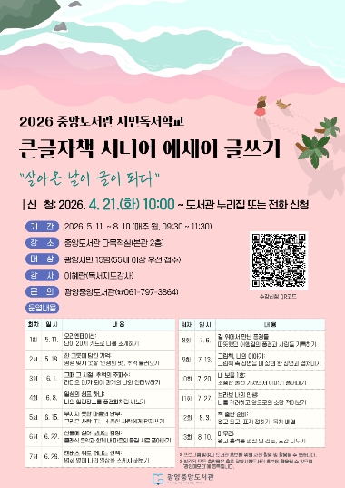 프로그램은 5월 11일부터 8월 10일까지 매주 월요일 오전 9시 30분 광양중앙도서관 다목적실에서 총 13회에 걸쳐 운영된다. 모집 대상은 55세 이상 광양시민 15명이며, 수강료는 무료다.