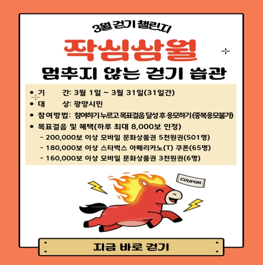 광양시 관계자는 “3월 4일 비만예방의 날을 맞아 이번 걷기 챌린지를 통해 시민들이 일상 속에서 자연스럽게 신체활동을 늘리는 계기가 되길 바란다”며 “걷기 실천을 통해 비만은 물론 고혈압, 당뇨 등 각종 만성질환 예방에도 도움이 되길 기대한다”고 말했다.