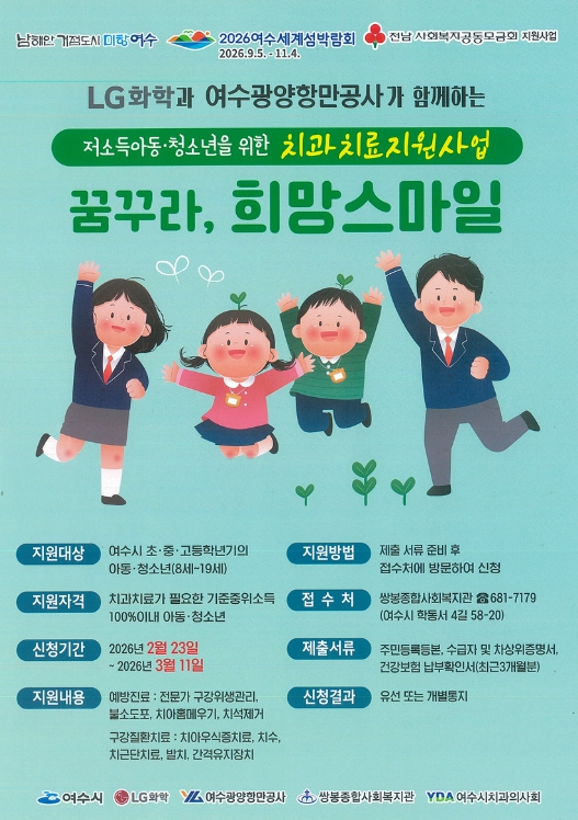 '꿈꾸라, 희망스마일'은 2020년 7월 여수시를 비롯해 LG화학 여수공장, 여수광양항만공사, 여수시치과의사회, 쌍봉종합사회복지관 등 5개 기관이 업무협약을 체결해 추진 중인 민관 협력 복지사업으로 올해로 7년째를 맞았다.