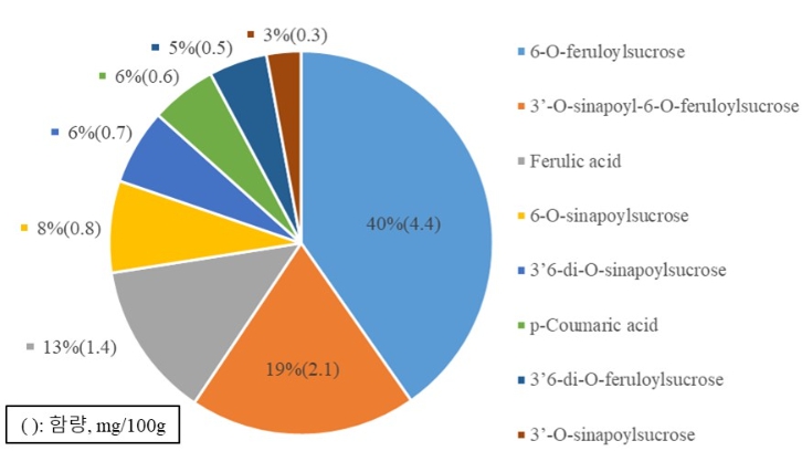농촌진흥청 식생활영양과 연구진의 정밀 분석 결과, 국산 현미(‘삼광’)에서 총 8종의 페놀산 성분을 확인했으며, 이 중 6종이 배당체 형태로 밝혀졌다. 그 중 ‘6-O-페룰로일슈크로스(6-O-feruloylsucrose)’가 총 페놀산 함량의 약 40%(100g 당 생중량, 4.4mg)를 차지하는 가장 중요한 성분으로 확인됐다. 특히, ‘3′-O-시나포일슈크로스(3′-O-sinapoylsucrose)’는 세계 최초로 현미에서 존재가 확인됐다.