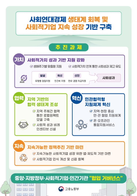 사회적기업을 비롯한 사회연대경제조직이 지방정부, 민간기관, 시민사회 등 지역사회 다양한 주체들과 연대하여 취약계층 일자리, 돌봄 등 지역사회가 직면한 문제를 스스로 정의하고 해결할 수 있도록 협력 생태계 조성을 지원(국비 137억 + 지방비 59억)한다. 또한, 사회연대경제 조직의 사회성과를 화폐가치로 측정해, 성과에 비례한 인센티브를 지급하는 사업도 내년부터 시범적으로 추진(국비 50억 + 지방비 50억)한다.