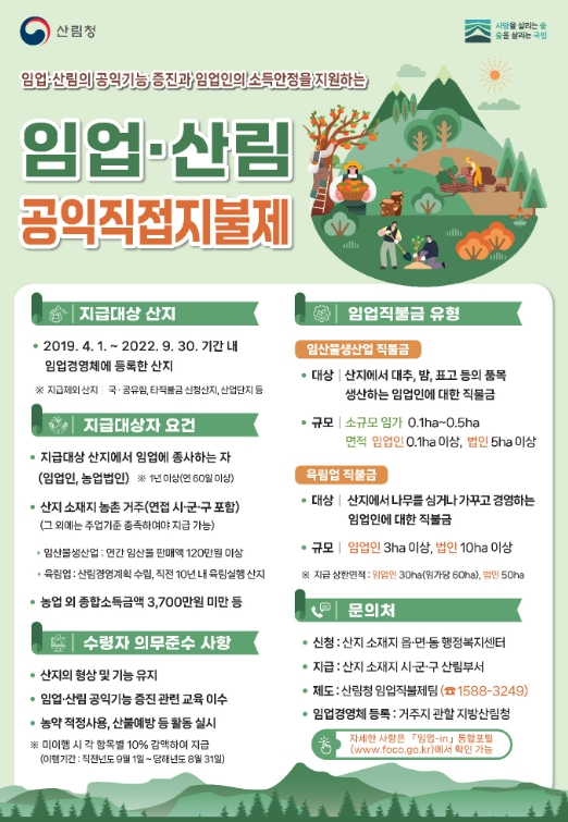 임업·산림 공익직접지불제는 산림의 공익기능을 높이고 임업인의 소득 안정을 지원하기 위해 일정 요건을 충족한 임업인에게 지급하는 제도다.
