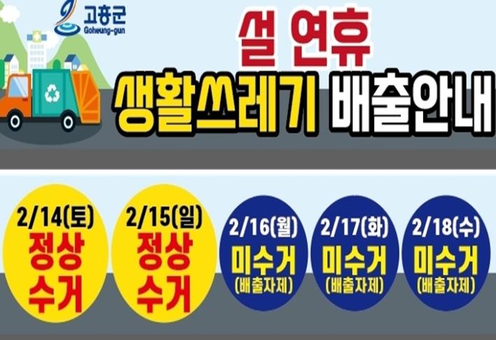 군은 2월 14일부터 15일까지는 설 명절에 발생한 생활폐기물을 정상 수거하며, 이 기간 환경미화원 등 약 100명을 투입해 평소와 같이 안정적인 수거 서비스를 제공할 계획이다.