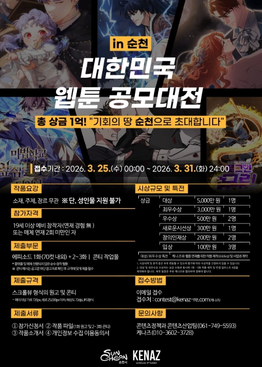 시 관계자는 “이번 공모대전을 통해 전국의 수많은 예비 창작자들이 지역과 함께 성장할 수 있는 발판을 마련했다”며 “순천시가 웹툰 산업의 새로운 거점으로 자리매김할 수 있도록 지속적으로 노력하겠다”고 말했다.