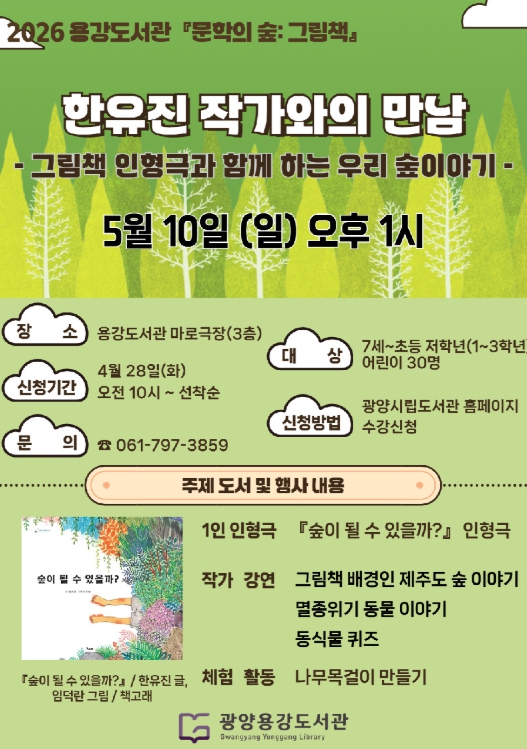 자세한 사항은 광양시립도서관 누리집 문화행사 게시판을 통해 확인하거나 광양용강도서관으로 문의하면 된다.