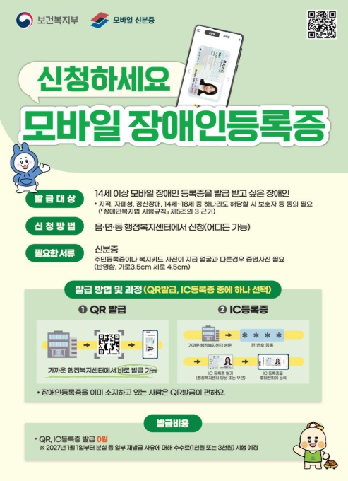 모바일 장애인등록증은 플라스틱 재질의 장애인등록증을 발급받은 장애인이 추가로 신청할 수 있으며, 발급 비용은 무료다.