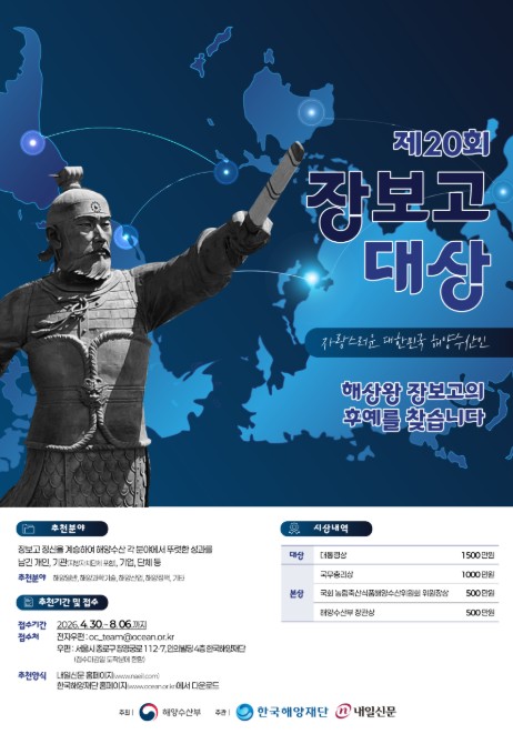 유은원 해양수산부 해양정책관은 “장보고대상은 바다를 위해 묵묵히 헌신해 온 숨은 영웅을 발굴하고 알리기 위한 상”이라며, “올해 20회를 맞은 만큼, 아직 세상에 알려지지 않은 해양수산의 주역들이 널리 조명받을 수 있도록 많은 관심과 추천을 부탁드린다.”라고 말했다.