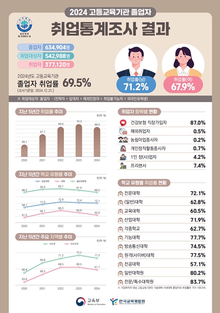 이번 통계 결과는 전국 고등교육기관의 2024년 2월과 2023년 8월 졸업자 63만 4,904명을 대상으로 한다. 2024년 12월 31일 기준 취업 및 진학 현황, 취업 준비기간, 급여 수준 등의 취업 상세 정보를 조사했다.