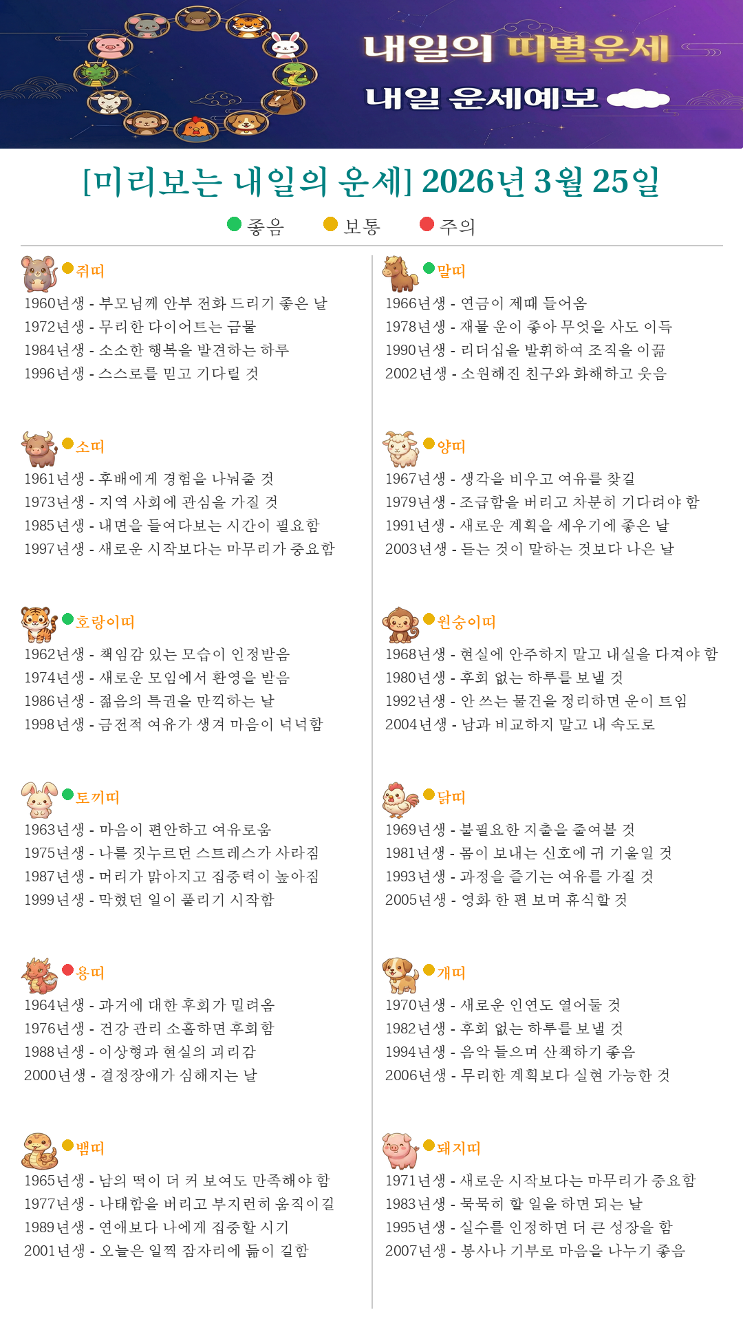 | 하루를 버텨낸 퇴근길, 우리는 내일을 걱정하지만 정작 내일을 준비할 여유는 갖지 못한 채 집으로 향합니다. 지역에서 살아가는 청년의 하루 역시 크게 다르지 않습니다. 포커스N전남은 ‘미래를 맞히는 운세’가 아니라, 내일을 조금 더 단단하게 살아가기 위한 마음의 점검으로 띠별운세를 다시 해석합니다.〈퇴근길 미리보는 내일의 띠별운세〉는 오늘의 피로를 정리하고, 내일의 선택을 차분히 바라보자는 취지에서 출발했습니다. 오늘도 고생 많으셨습니다. 내일은, 지역에서의 삶이 조금 더 나아지길 바랍니다.[편집자주] |