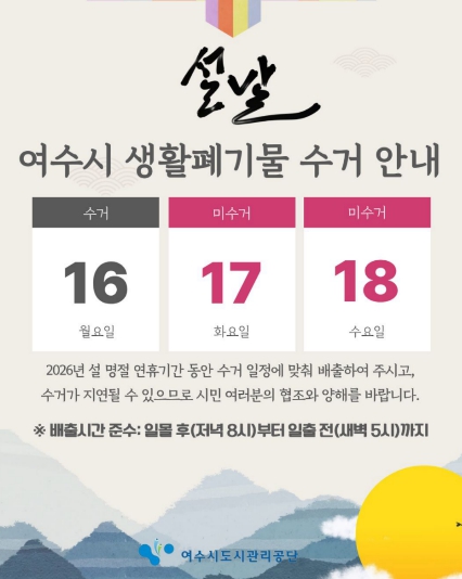 공단은 연휴 기간 중 발생할 수 있는 민원에 신속히 대응하기 위해 여수시와 협력 체계를 유지하며, 체계적인 상황관리 체제를 운영한다. 특히, 설 연휴 기간 중 17일~18일은 생활폐기물 정기 수거가 일시 중단되나 비상근무를 통해 현장 대응을 강화하여 시민 불편을 최소화할 방침이다.