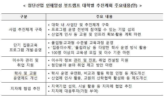 ‘첨단산업 인재양성 부트캠프’는 다양한 배경의 학생들이 대학과 기업이 공동으로 개발·운영하는 1년 이내 단기 집중교육을 통해 첨단분야 산업에 진출할 수 있도록 기획됐다. 2023년 반도체 분야 10개교를 시작으로, 2024년 이차전지, 디스플레이, 바이오, 항공우주 등 다양한 첨단분야로 확대하여 총 42교를 지원했다. 2025년에는 미래차, 인공지능(AI) 분야까지 확대하여 총 7개 분야, 47개교를 지원하고 있다.