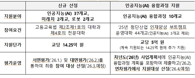 2026년 주요 추진 사항은 다음과 같다. 첫째, ‘로봇’ 분야를 신설하고, 인공지능(AI) 37개교, 미래차 2개교, 로봇 2개교 등 41개교를 신규 선정하여 총 8개 분야 88개교를 지원한다. 선정된 대학은 교당 평균 14.25억 원의 재정지원을 받게 되며, 향후 5년간 연간 100명 이상의 첨단 인재를 양성한다.