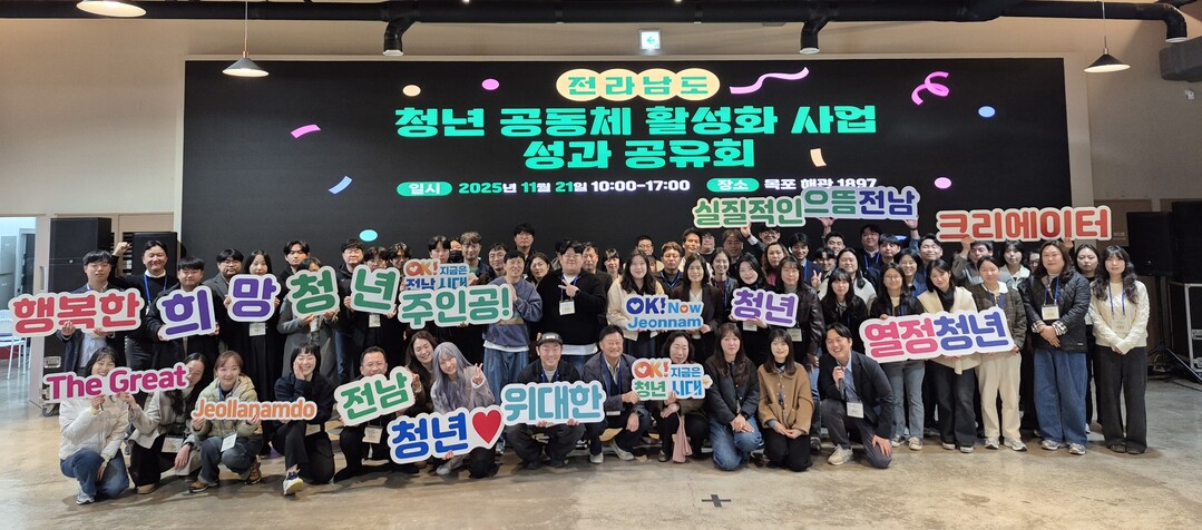 전라남도는 21일 목포 해관 1897에서 전남형 청년공동체 활성화 지원사업 성과공유회를 열고 한 해 동안 청년들이 지역에서 만들어 온 변화와 성과를 공유했다. 성과공유회에는 20개 시군의 우수공동체 참여자와 관계자 등 100여 명이 참석해 활동 사례를 발표하고 의견을 나누며 교류의 시간을 가졌다.