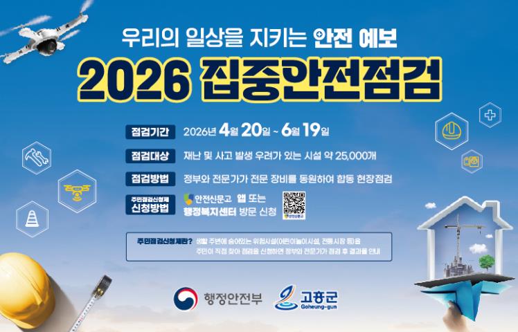 아울러 ‘주민 점검 신청제’를 운영해 군민이 생활 주변의 위험요인을 직접 제보하고 점검에 참여할 수 있도록 함으로써 주민 참여형 안전관리 체계를 강화할 계획이다.