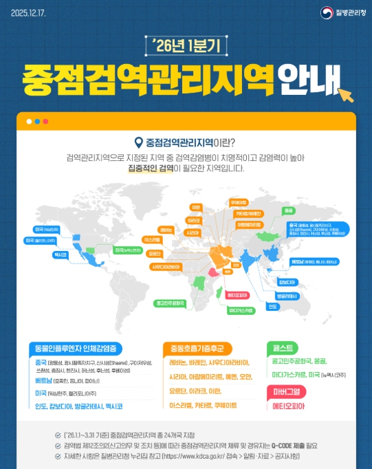 질병관리청은 해외감염병 발생 동향과 위험성 평가를 반영하여 총 24개국가(지역)를 중점검역관리지역으로 지정하여 운영하고 있으며, 해당 지역을 방문하거나 체류 후 입국하는 경우에는 Q-CODE(또는 건강상태질문서) 제출을 통해 검역관에게 건강상태를 신고하도록 하고 있다.
