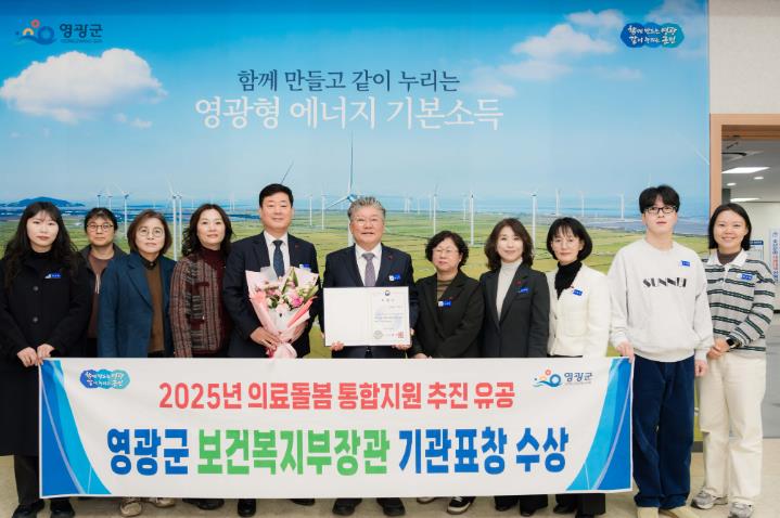 보건복지부에서 전국 243개 지자체 중 통합지원 추진체계를 안정적으로 구축하고 운영한 17개 지자체를 유공기관으로 선정했으며, 영광군은 촘촘한 통합 돌봄 체계의 기반을 마련하고, 민관의 유기적 협력으로 지역 내 다양한 돌봄서비스를 효과적으로 제공하여 높은 평가를 받았다.