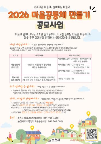 문의는 순천시마을공동체지원센터 또는 순천시 자치행정과 마을공동체팀으로 하면 된다.
