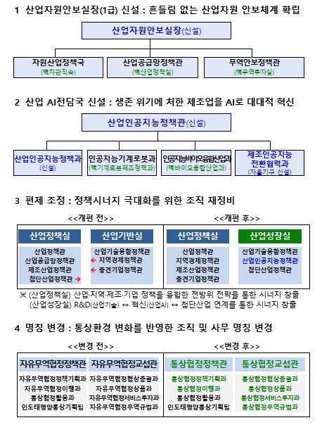 이번 조직개편은 국민주권정부 국정과제의 속도감 있는 이행을 위한 조직 기능 강화와 에너지기능 분리 이후 자원산업 재배치, 지역 성장 및 기업 활력 제고 등 정책시너지 창출을 위한 조직 재정비 차원에서 마련됐다.