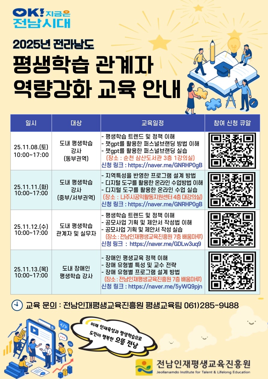 참가 신청은 안내 포스터에 포함된 QR코드나 링크를 통해 접수 가능하며, 자세한 내용은 전남인재평생교육진흥원 평생교육팀으로 문의하면 된다.