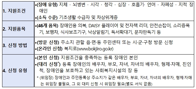 장애인 보조기기 교부 사업은 기초생활 수급자 및 차상위계층에 해당하는 등록 장애인을 대상으로 일상 생활의 편의를 돕기 위한 보조기기를 무료로 지원하는 사업이다.